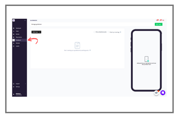 The guidebook will appear in your guest area. Your Guests will be automatically redirected to the guest area after completing the pre-check-in and will be able to access it throughout their stay. To start creating your guidebook, click on the guidebook page in the sidebar menu. On the right side of the screen, you will have a complete preview of the guidebook and will be able to view all the categories and posts you create.