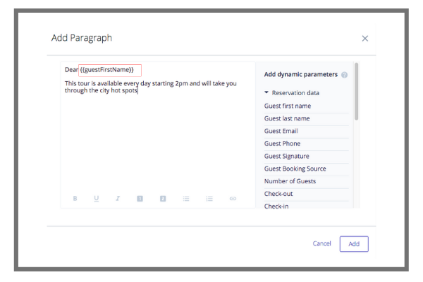 When choosing a text content block you have the option to personalize your content by using the dynamic parameters that are taken from your reservation details.