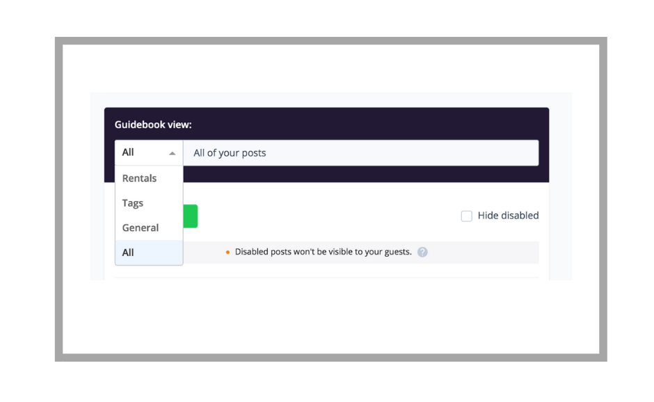 Using the guidebook view drop down, you will be able to filter the guidebook content you want to see. By default, your guidebook view will be on the 'ALL' view, allowing you to see all the posts you created no matter what rental or tag they are associated with.