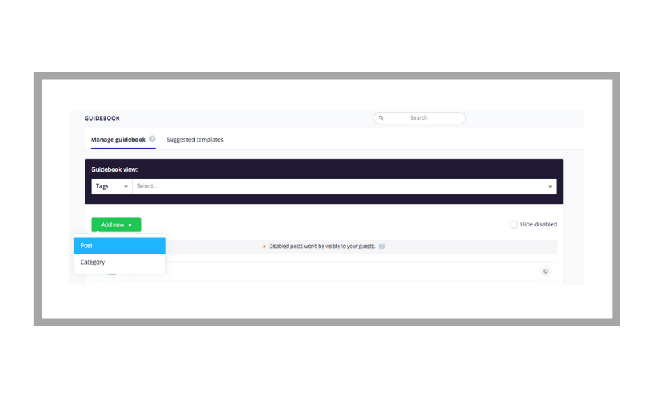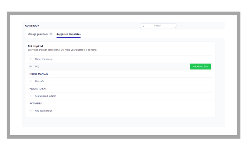 You can easily add a new post to your guest guidebook by copying posts from the suggested templates. Go to the suggested templates tab, hover over a specific post and click Add and Edit.