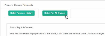 6. From the main left menu select Owners | Owners Payments and then click the tab click "Batch Pay All Owners" and at the bottom of the screen click "Batch Pay All Property Owners"