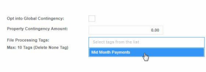 5. Now open a property file that you wish to include in your mid-month payments, in the lower left section of the screen you will notice a field: "File Processing Tags": Click into this field and you will see the process tag you created. Click on the tag to apply it to this property, make sure you click "Save Property Changes" to apply the changes you made.