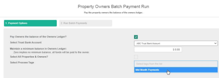 7. This screen allows you to set up a payment process. To process only properties with the "Mid Month Payments" tag untick the option: "Select All Properties & Owners?" this will enable the "Select Process Tags" field. Click into the field to select the tag, one you have selected the other options, click "Next" and you will notice only the properties that had the "Mid Month Payments" tag applied will appear.