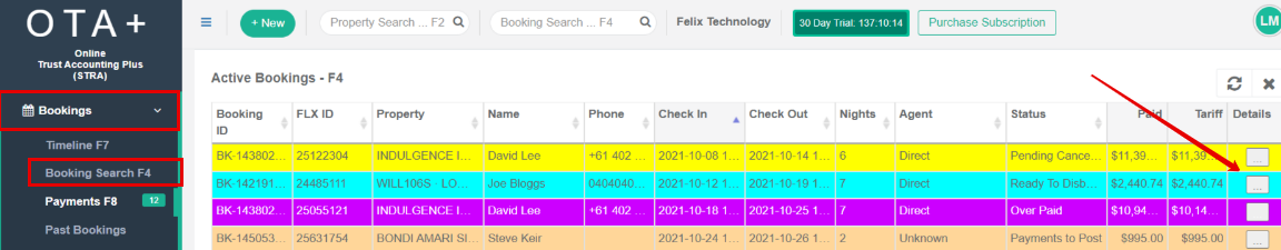 Once each booking is blue or purple, open up the booking in OTA+ to check the relevant information prior to disbursing funds.