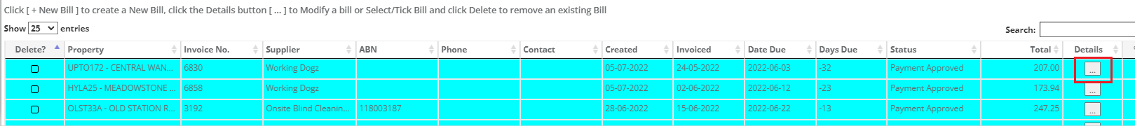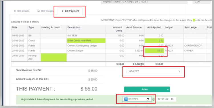 3 - if the bill simply must be paid in full, you can pay the shortfall out of one of your holding accounts. Simply click on the Green box in the Holding Account column of the Holding Acc row to select the relevant account, then enter the shortfall into the Amount Applied column pertaining to that row. Alternatively you can journal funds from a holding account to the owners ledger prior to paying the bill. You can also, if time permits, transfer funds from your business account to the trust account and mark the payment as a loan to the owner using the Trust Account > Receipts process. The final, and probably cleanest option, is to delete the bill from OTA+ and pay the invoice out of your business account. For any of these methods, be sure to create an invoice to the owner so those funds are repaid to you at a later date.
