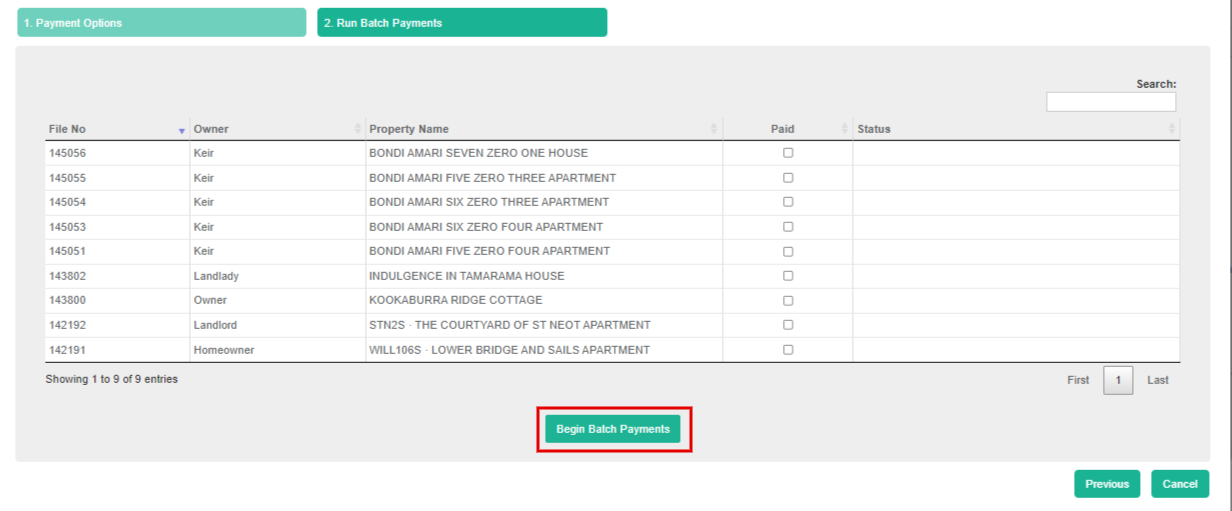 In the Run batch payment screen all you need to do is select "Begin Batch Payments" and it will begin to payout each owner one by one automatically.