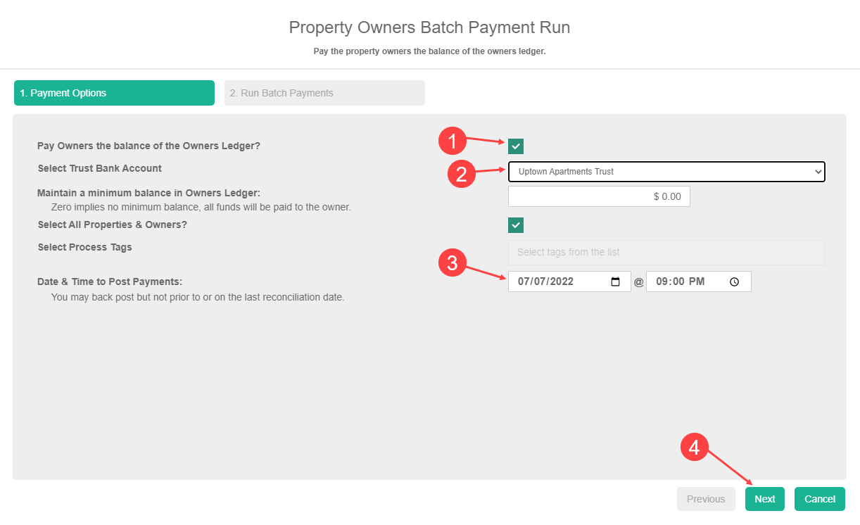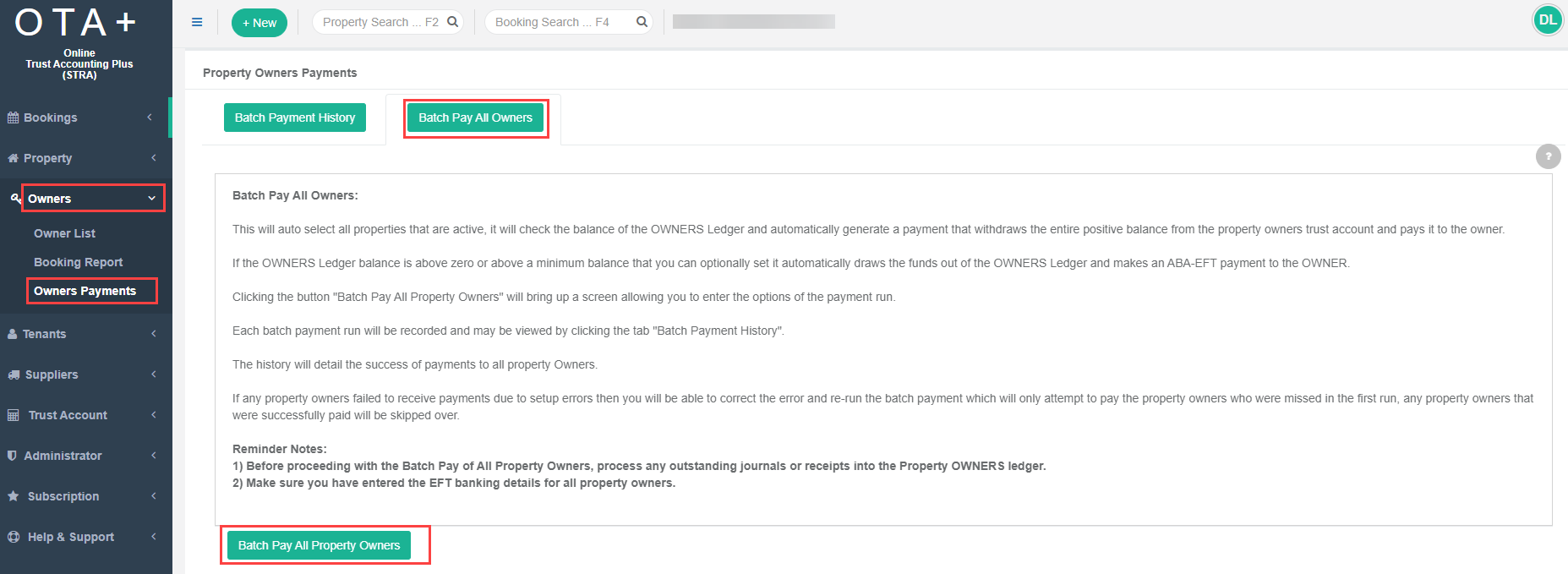 To begin the Batch Pay process Select Owner > Owners Payments, then select Batch Pay All Owners tab. Then select Batch Pay All Property Owners at the bottom.