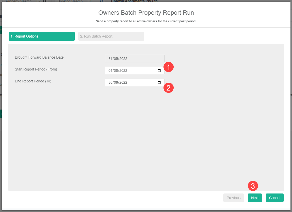 Enter the date after the previous Report End Date in the Start Report Period (From) setting. Enter the date of the owner disbursements (which will either be the current date or the backdated date entered in the previous step) then click on Next.