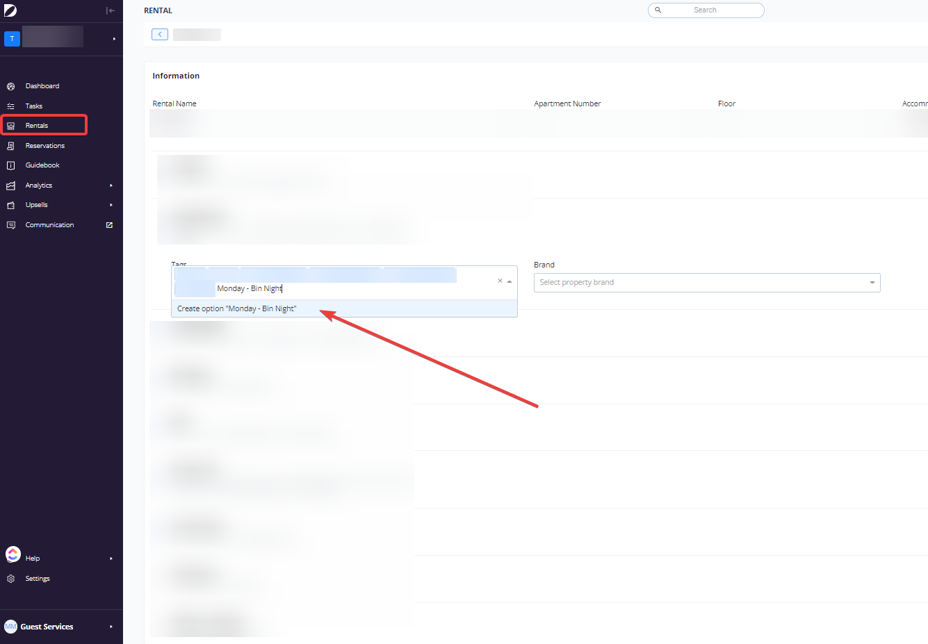 Let's say in this instance, the following property's bins get collected Tuesday morning. Scroll down to "Tags" and write "Monday - Bin Night" then press enter. This has now created the tag "Monday - Bin Night", which can now be selected in the next property with a collection Tuesday morning. Don't forget to click the save button before moving to the next property. You will need to go from top to bottom until all properties have the relevant tag.