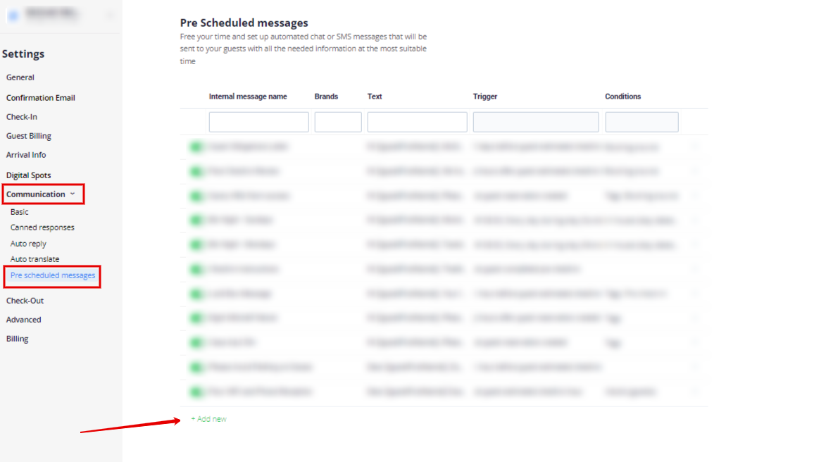 Next, select settings down in the bottom LH corner. Communications > Pre-scheduled messages