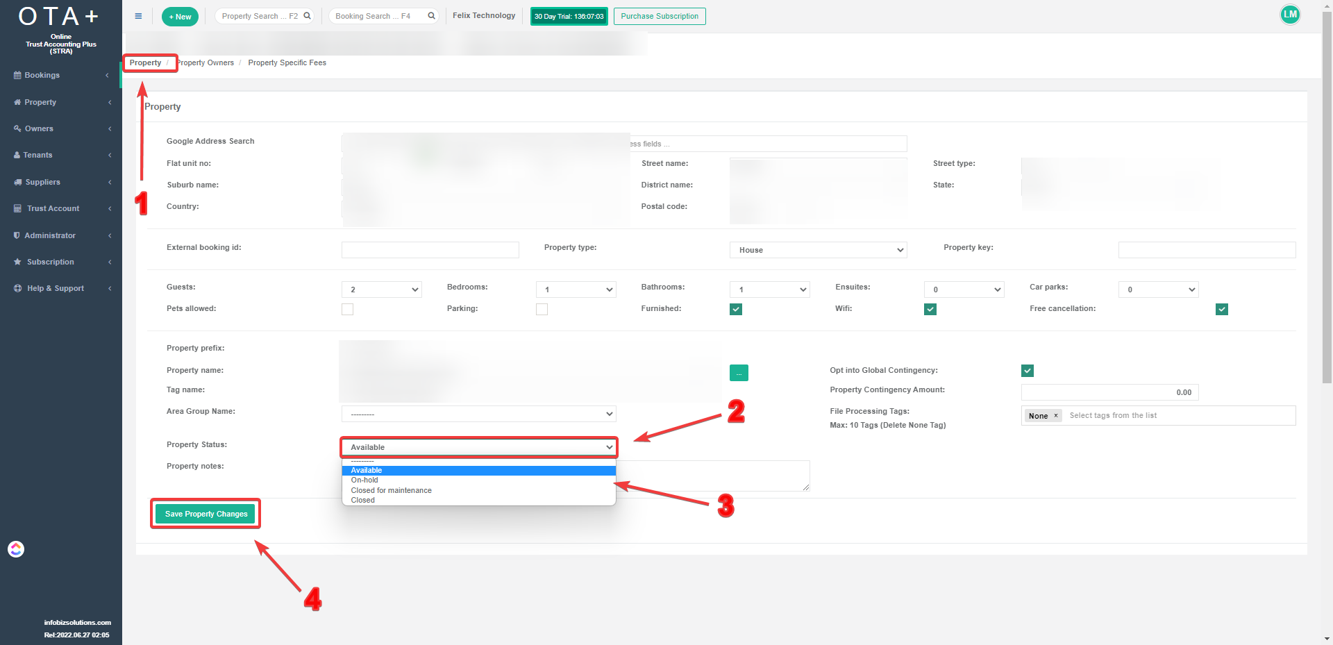 Next, click on the first tab, select the Property Status bar and from the options select either 'On Hold' or 'On Hold for Maintenance' and then click "Save Property Changes button". That will stop the owner payments being made and owner reports being sent out via the batch actions.