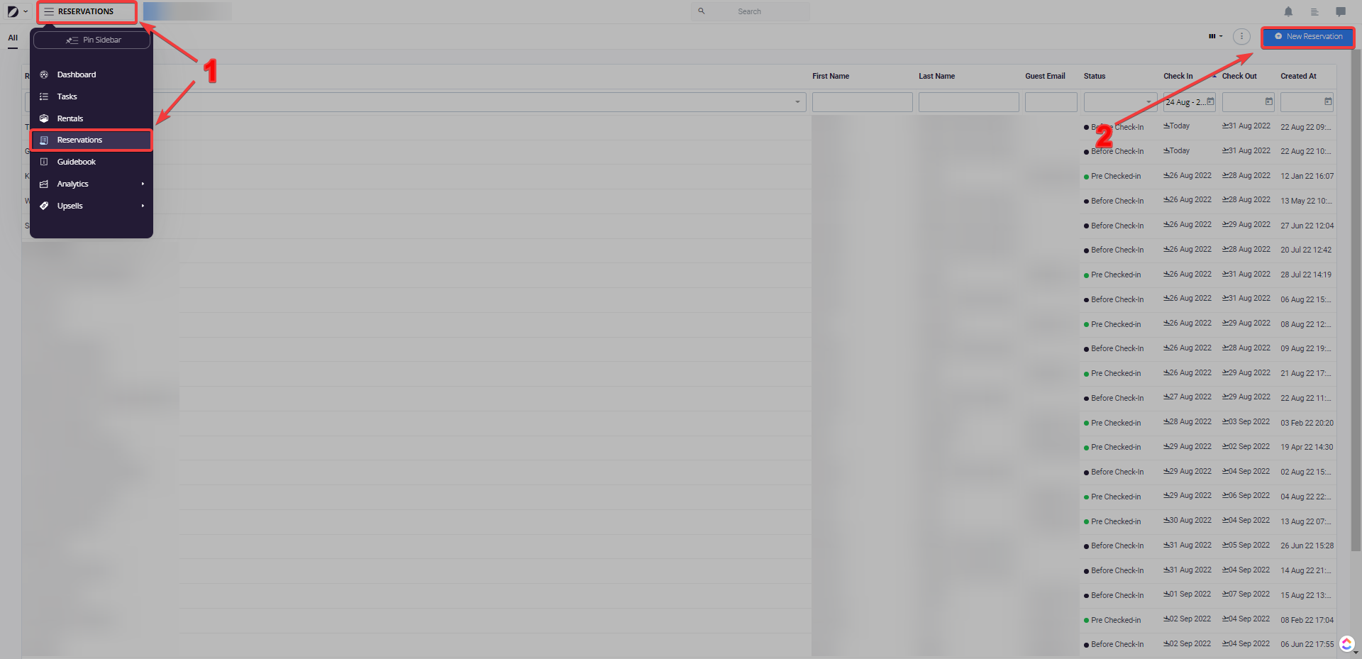 First click on the 3 lines at the top LH side of the screen to access the drop down menu, then select reservations. Here you can see all active reservations - click "New reservation" to begin.