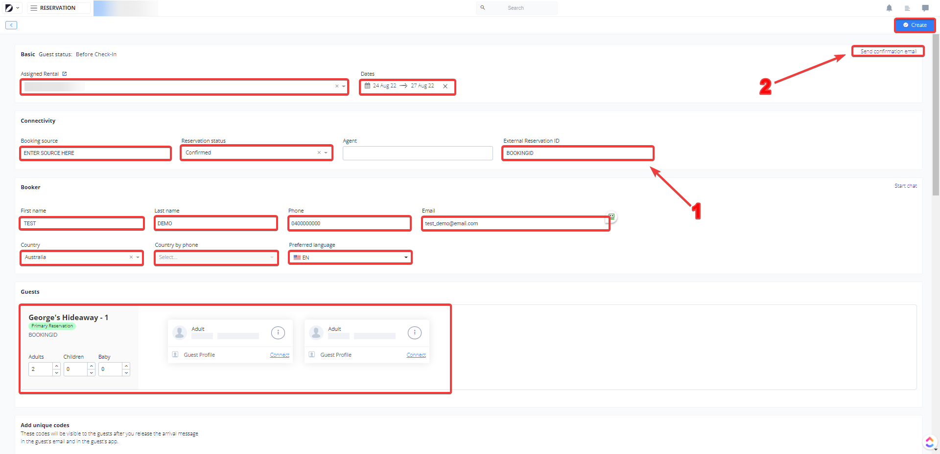 In the next screen fill out all the red boxes with relevant booking information, the most important ones being the customers email address and the Booking ID - which is the 8 digit number generated by Felix when a booking is created at the top of the booking screen. Once this is all done click "Create" and then "Send Confirmation Email" (Labelled 2) to send the guest their link for check-in.