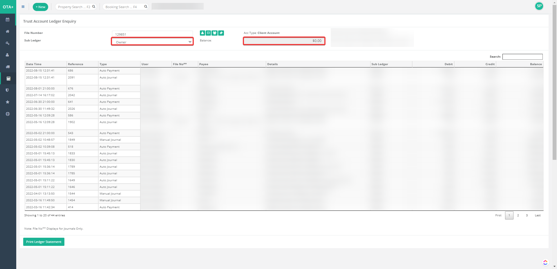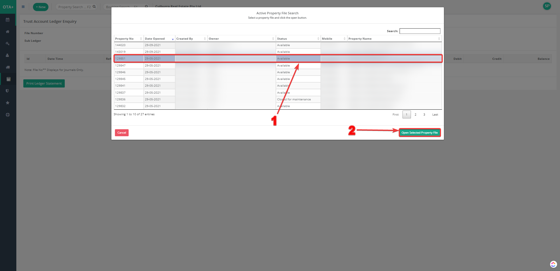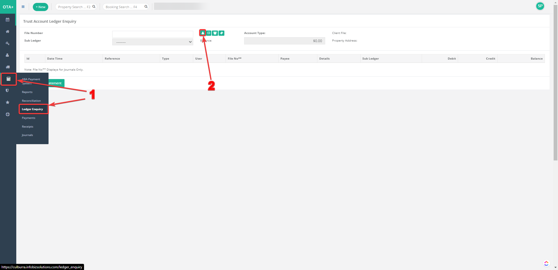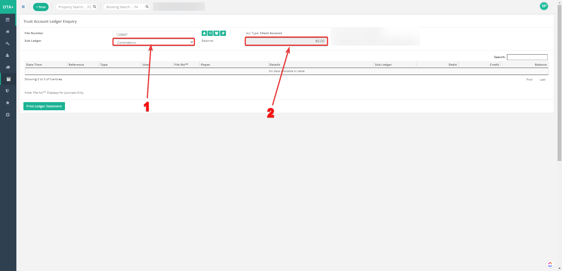 To check the the balance of an ownerls ledger or contingency ledger in OTA+, first select Trust Account > Ledger Enquiry. Then, from the four green boxes near the top, select the one furthest on the left (labelled 2) to select the relevant owner.
