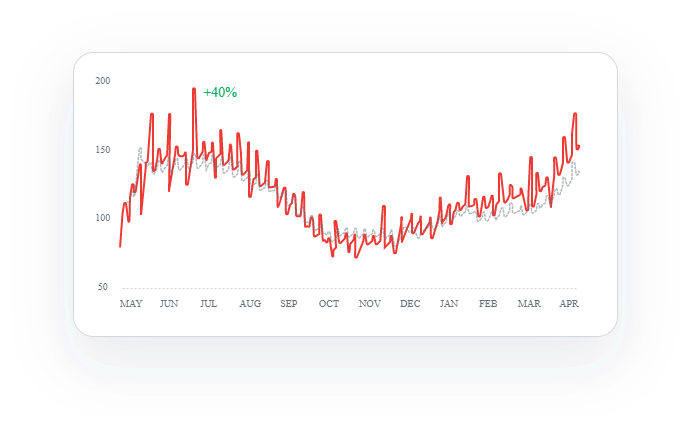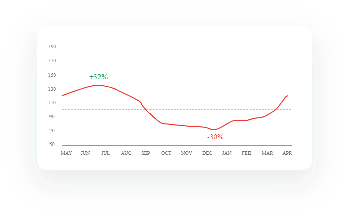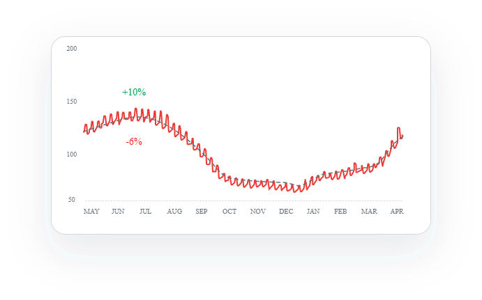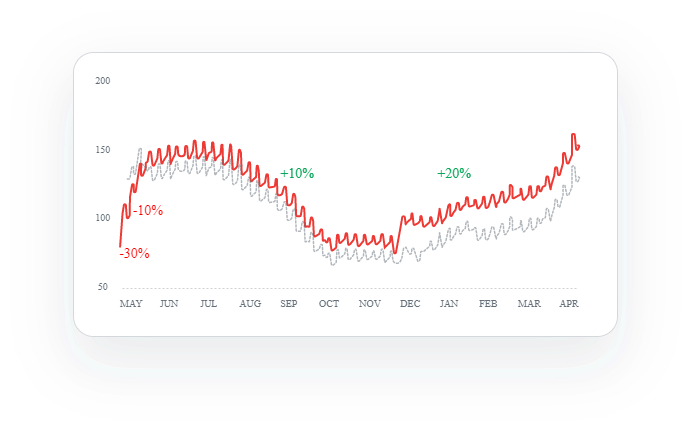 They then apply seasonal factors estimated from historic rentals and hotels in the area. Note that the seasonality is for a broad region - if you want to fine tune your seasonality, it can be done in a few ways (providing us the seasonality based on your portfolio, or by setting seasonal base prices)