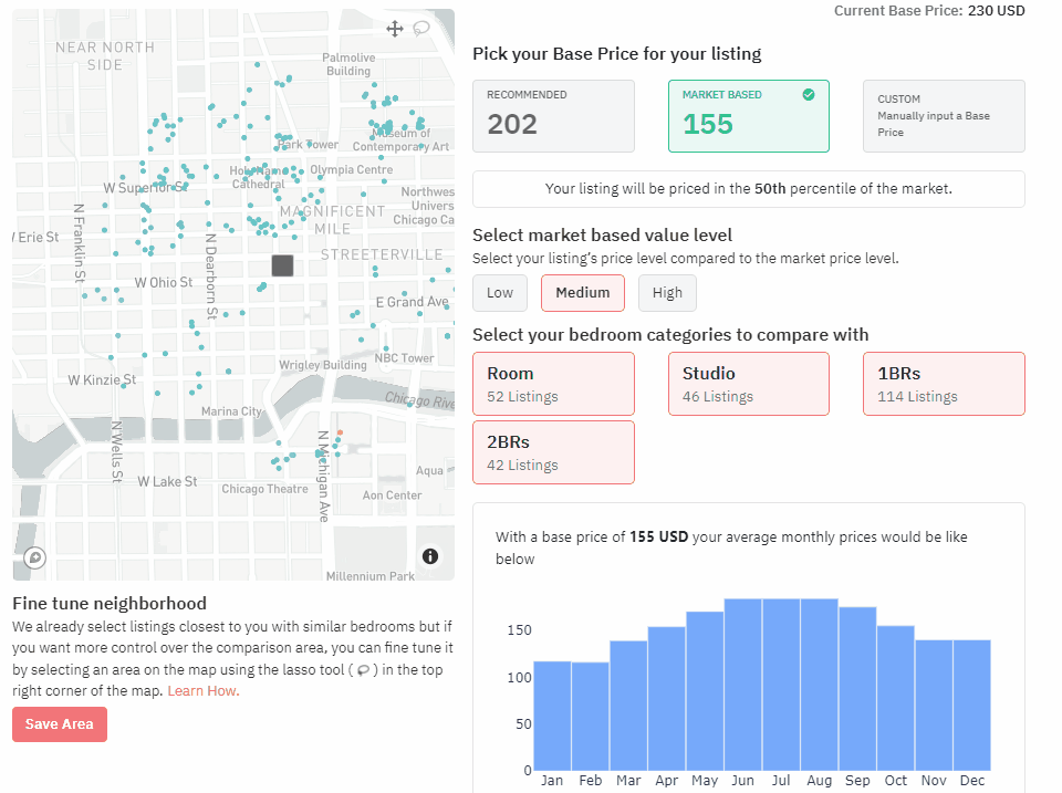 The Base Price Help tool helps you determine a good starting point for your listing's base price, using market data. This tool analyzes a few hundred listings nearest to yours, and the results can be filtered by the number of bedrooms to match your competition.