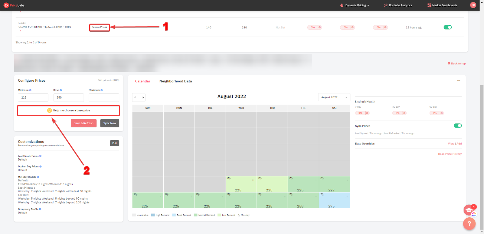To access this tool, first select Review Prices on the relevant listing (1), then select "Help me choose a base price" (2)