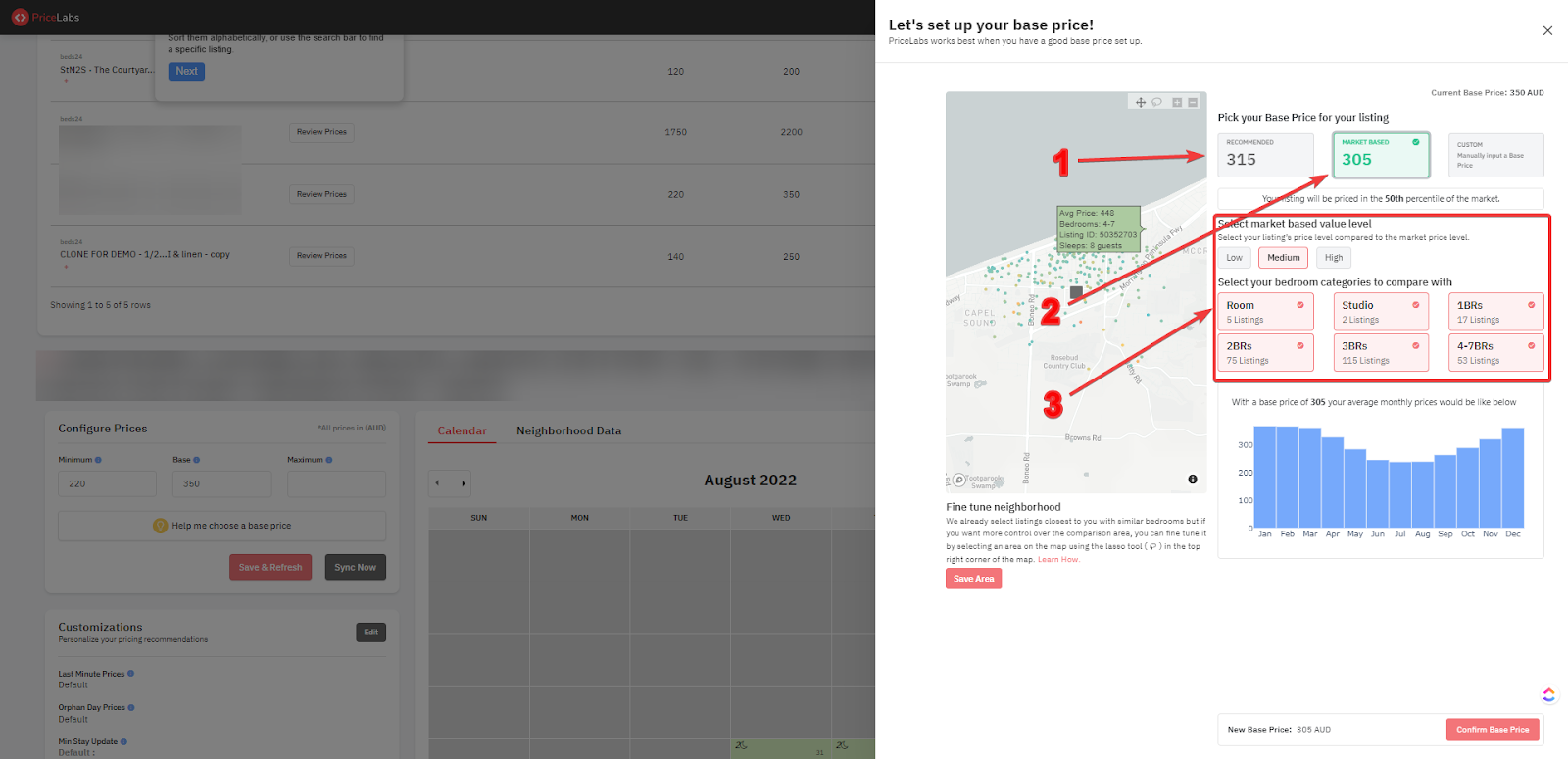 2. The Market Based price, which offers the opportunity to select which end of the market you would like to set pricing in accordance with (low, medium high), as well as bedroom categories you are trying to compete with.