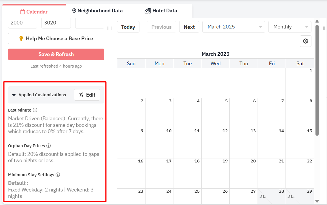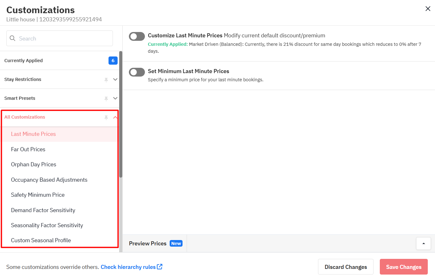 - Customization Rules: These are broad rules such as Last-Minute Pricing, Orphan Day Pricing, and Minimum Night Restrictions.