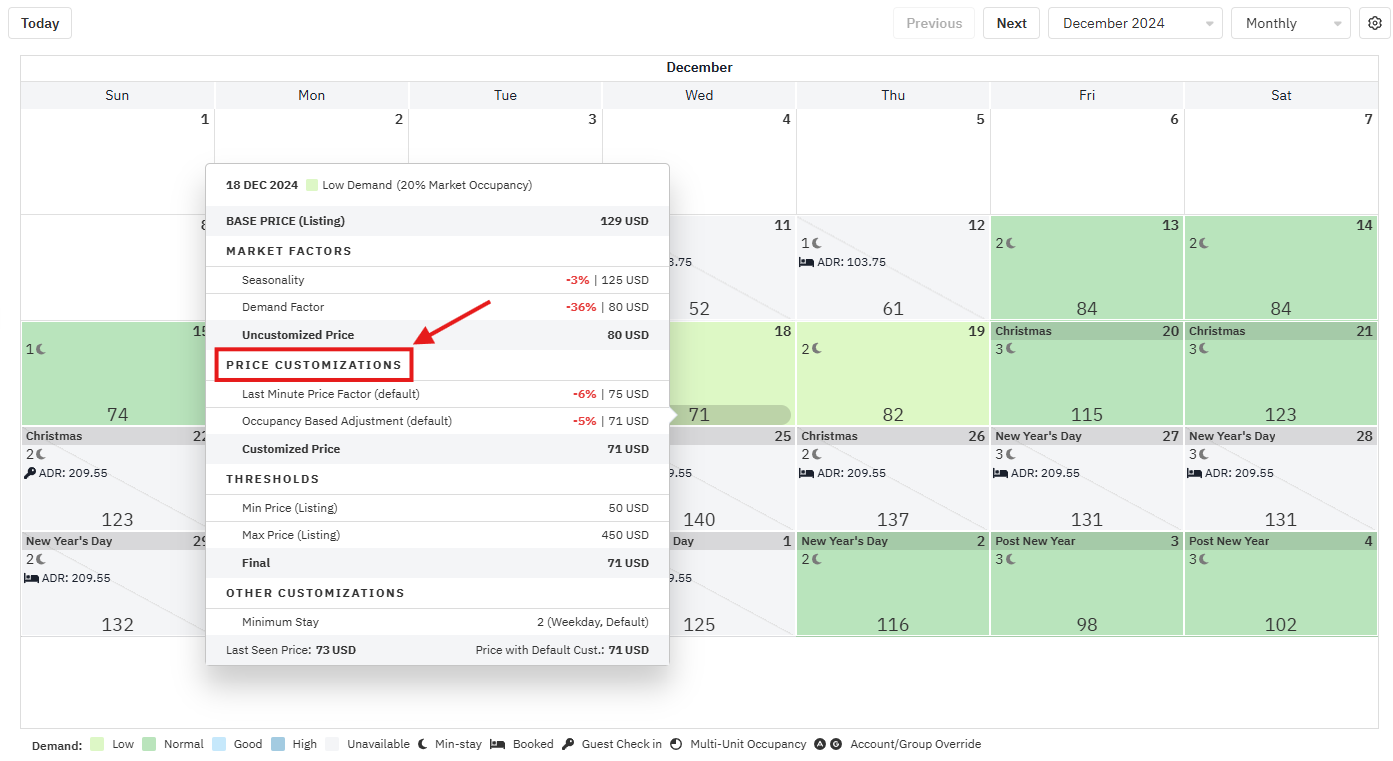 Any customizations (e.g., decrease prices for 2 night gaps by 20%) and date specific overrides (for example, to further increase prices for New Year's eve by 20%) are applied next.