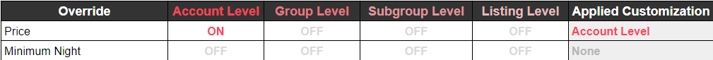 Minimum-night settings are all or nothing, meaning rules from different levels cannot combine (e.g., you cannot mix customizations from account-level and group-level rules).