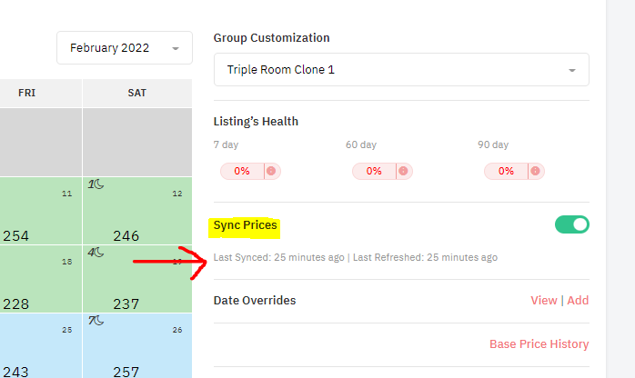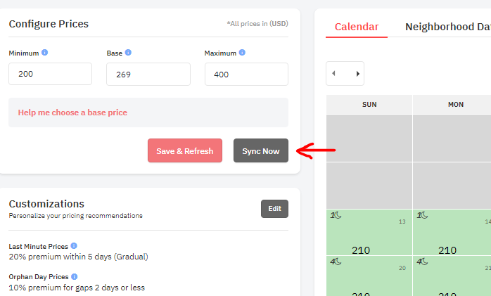 - Click 'Sync Prices' on the right, and then 'Sync Now' on the left. This will push the new dynamic prices back into Felix, as well as any minimum stay restrictions. You can go back into the Felix calendar for that property to double check it's all synced correctly.