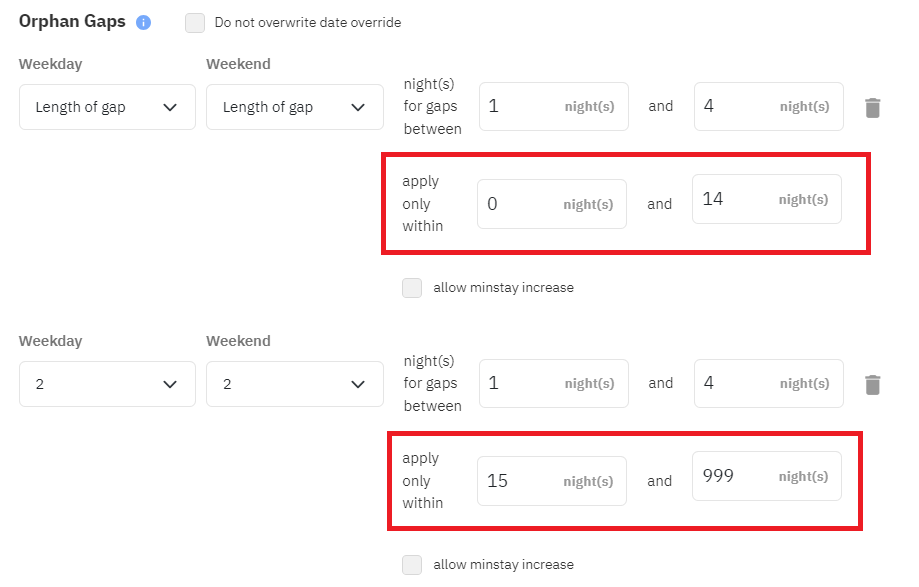 Length of Gap: For gaps of a specified length (e.g., 1 to 4 days), the minimum stay will be set to match the length of the gap.