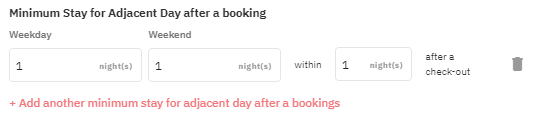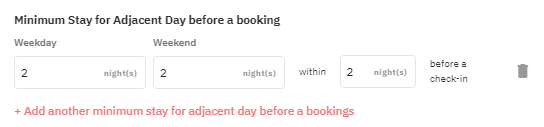 - These settings let you adjust the minimum stays for dates before and after existing bookings. They are specifically designed to accommodate shorter bookings when they do not create a gap night.