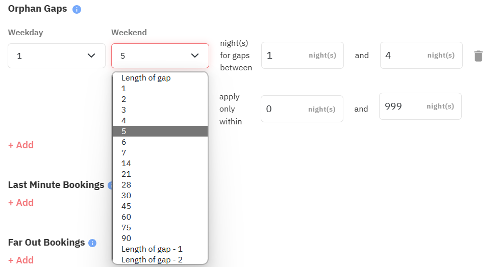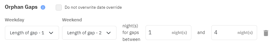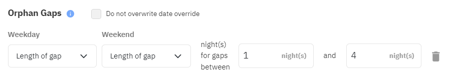 Length of Gap - 1 or 2: For gaps of a specified length (e.g., 1 to 4 days), the minimum stay can be set to one or two nights shorter than the length of the gap.
