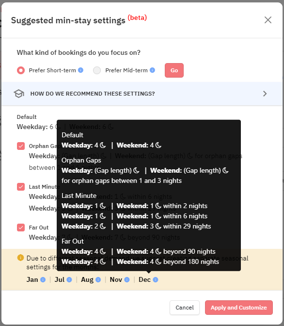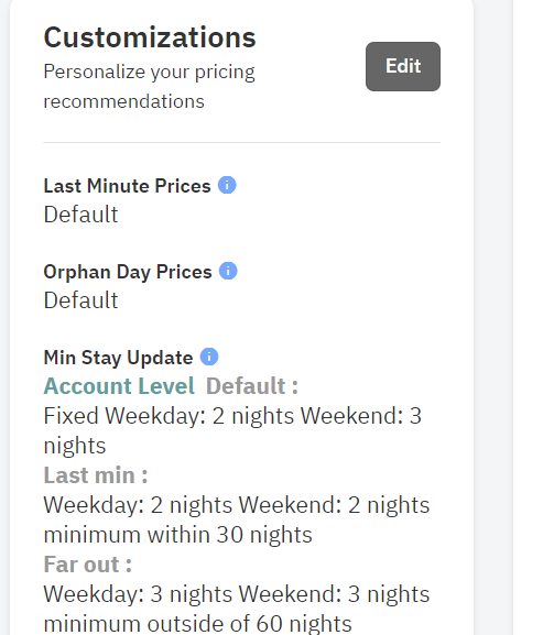 You can also apply minimum stay settings to specific groups of listings or your entire account through the Customization page (Dynamic Pricing > Customizations).