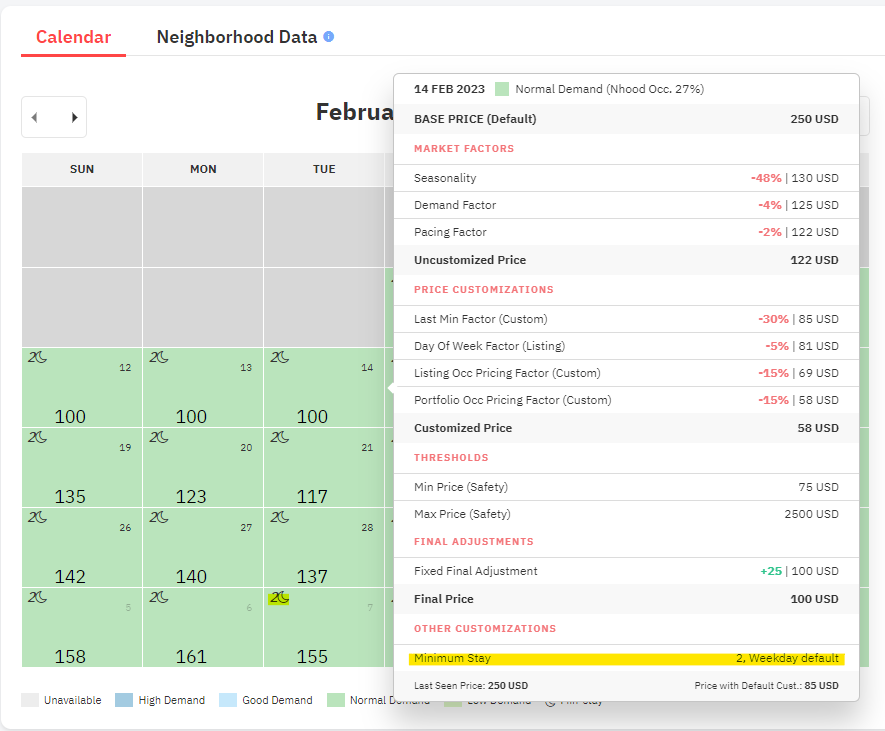 However, you are not bound by the minimum. A fixed Date Specific Override for the listing can cancel the effect of the minimum price, meaning the minimum price is then bound to be the override. For instance, the minimum price is set at $100, and a fixed override rate of $80 is set for some specific dates, so now the override will take precedence over the minimum.